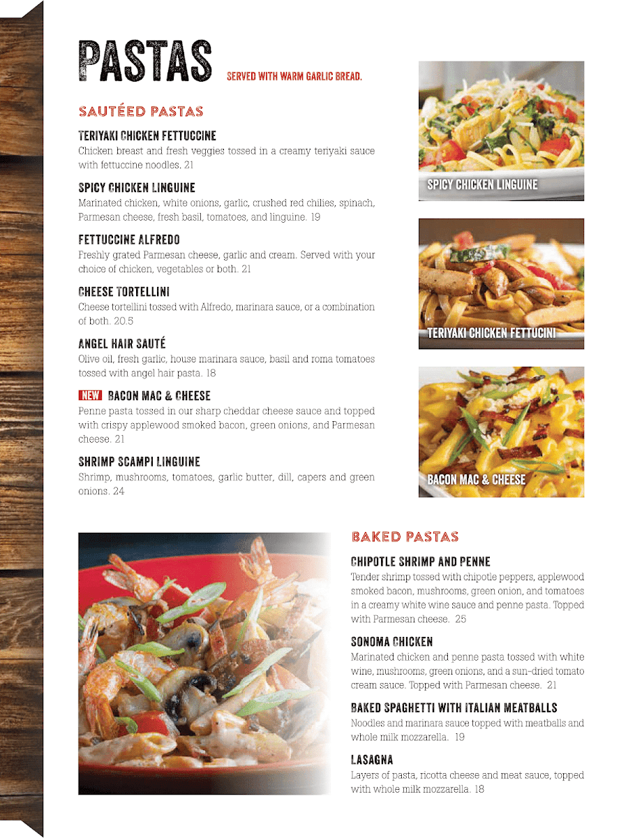 New. penne pasta tossed in our sharp cheddar cheese sauce and topped with crispy applewood smoked bacon, green onions, and parmesan cheese.