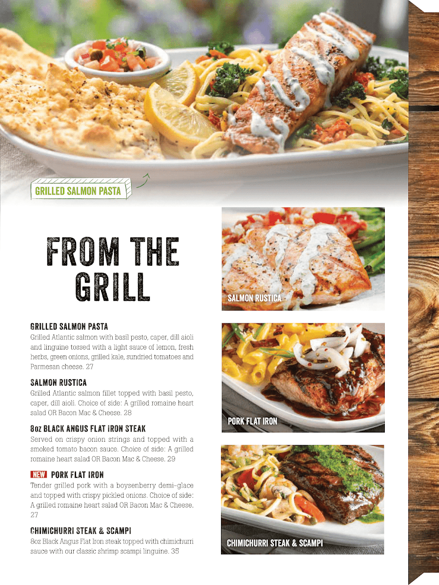 Grilled Atlantic salmon with basil pesto, caper, dill aioli and linguine tossed with light sauce of lemon, fresh herbs, green onions, grilled kale, sundried tomatoes and Parmesan cheese.